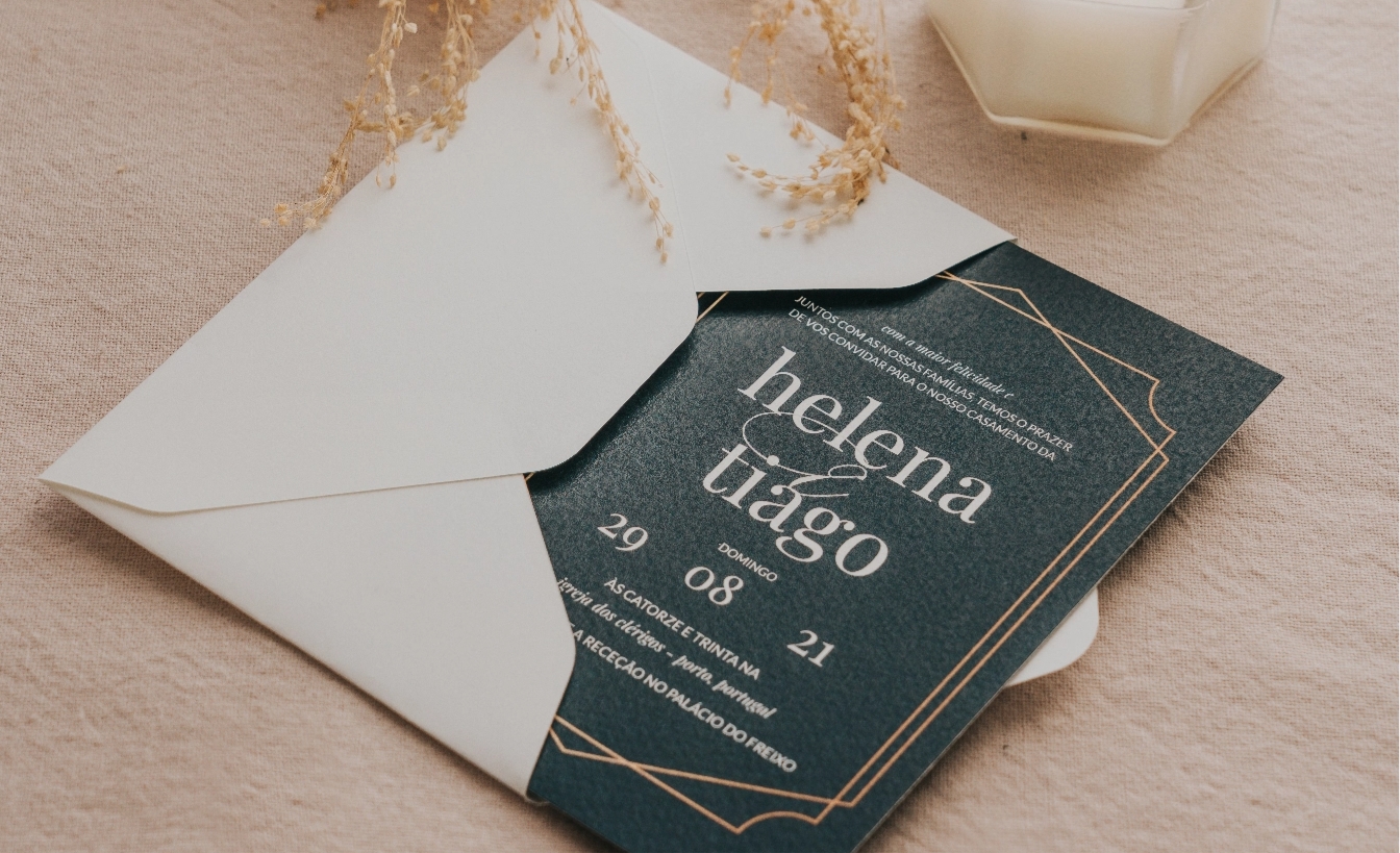 • A melhor parte, é que para além de poderes fazer convite de casamento online, podes complementar com envelope de convite de casamento - estes estão disponíveis em múltiplas cores, assim como a opção de adicionares um lacre.