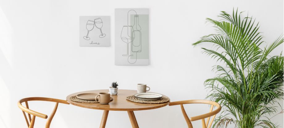 Normalmente na decoração da cozinha ou da sala de jantar, vê-se muitos quadros que condizem com o ambiente. Se for uma sala de jantar pequena, pode colocar apenas algumas foto telas pequenas.